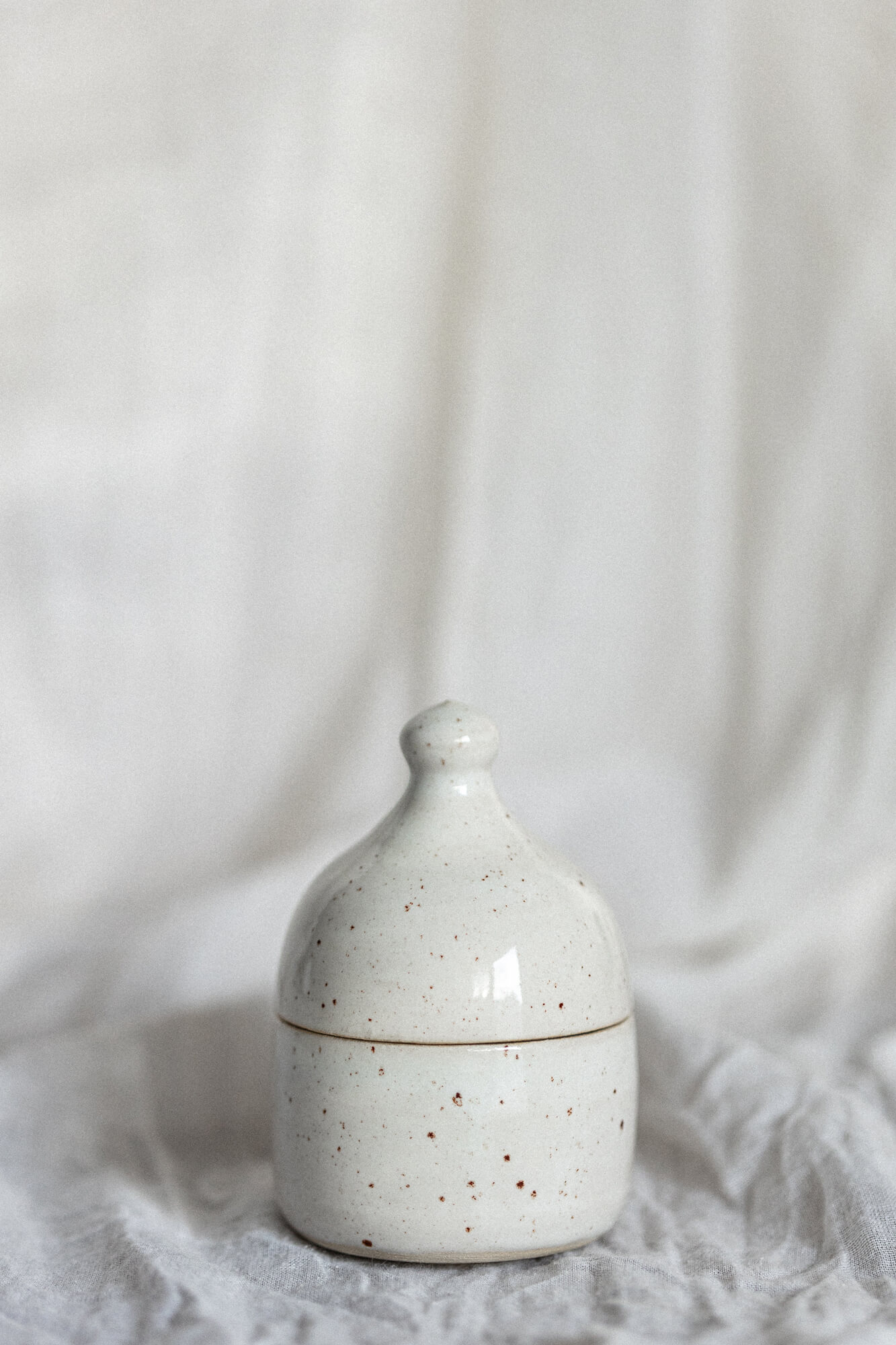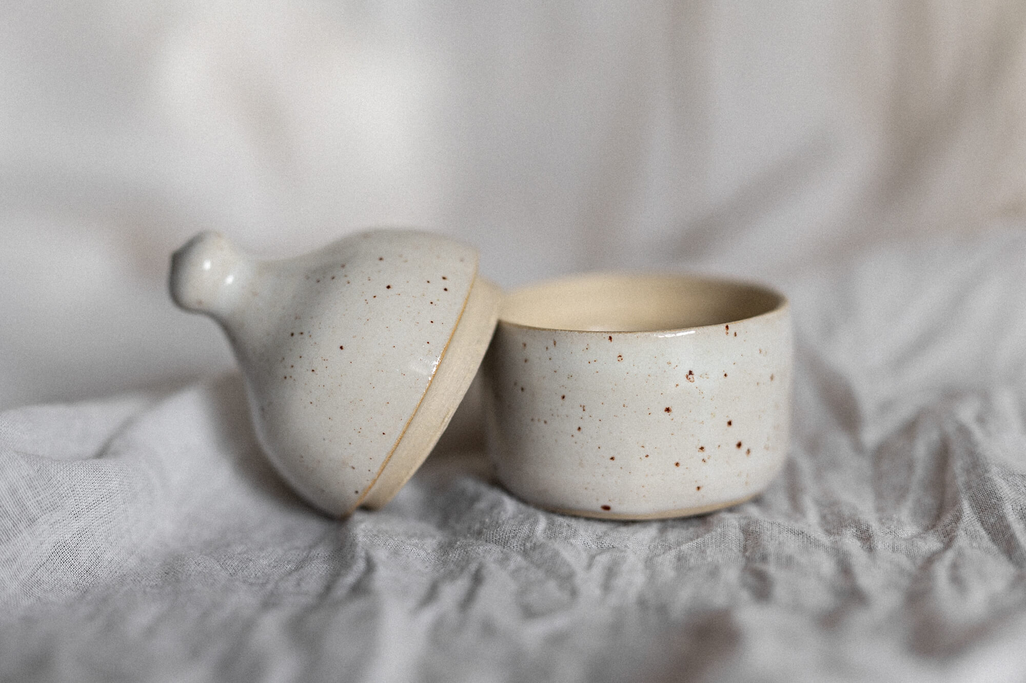 wenn ich mir meine keramik mit dieser glasur anschauen, muss ich zwangsläufig an eine leckere kugel italienisches stracciatella-eis denken! mhmmmmm! durch die helle und schlichte glasur passen die stücke aus dieser kollektion zu allem und oft gut zu alltagsgegenständen wie teller, tassen oder schalen weil man sich nicht daran satt sehen und sie zu allem kombinieren kann!